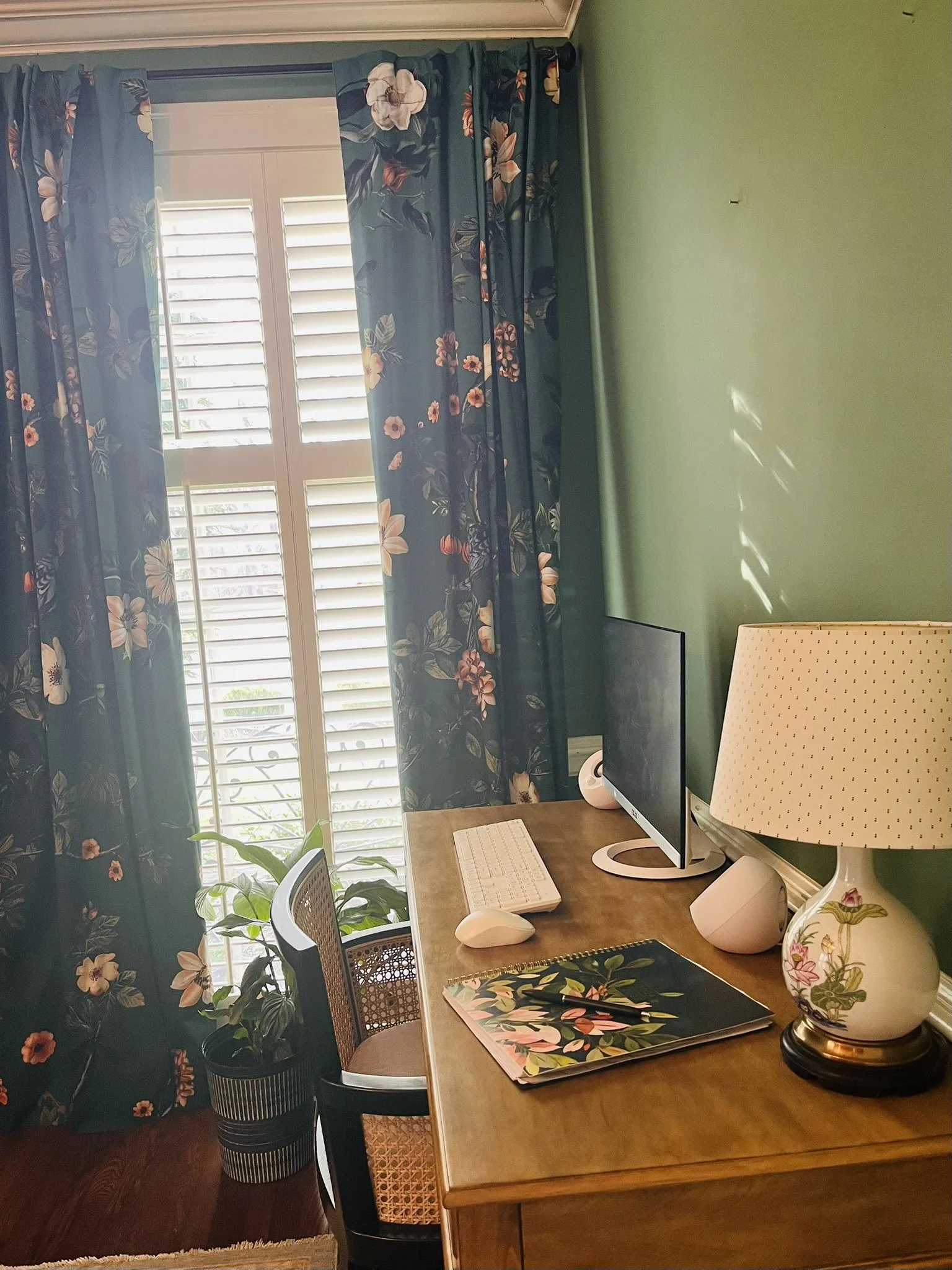 As for the decor, I originally had plain white curtain panels, but when I ordered my current ones from Anthropologie (originally intended for the living room), I decided to try them here on a whim—and instantly fell in love. They brought in exactly the mood I was going for. The room still isn’t “finished”—I haven’t quite figured out what to put on the walls, and these prints have migrated throughout my home over the years—but I still adore this green. I'd rather have something on the walls than nothing, and if you look closely, you’ll see nail holes all over my house—I tend to change things up every few months!
