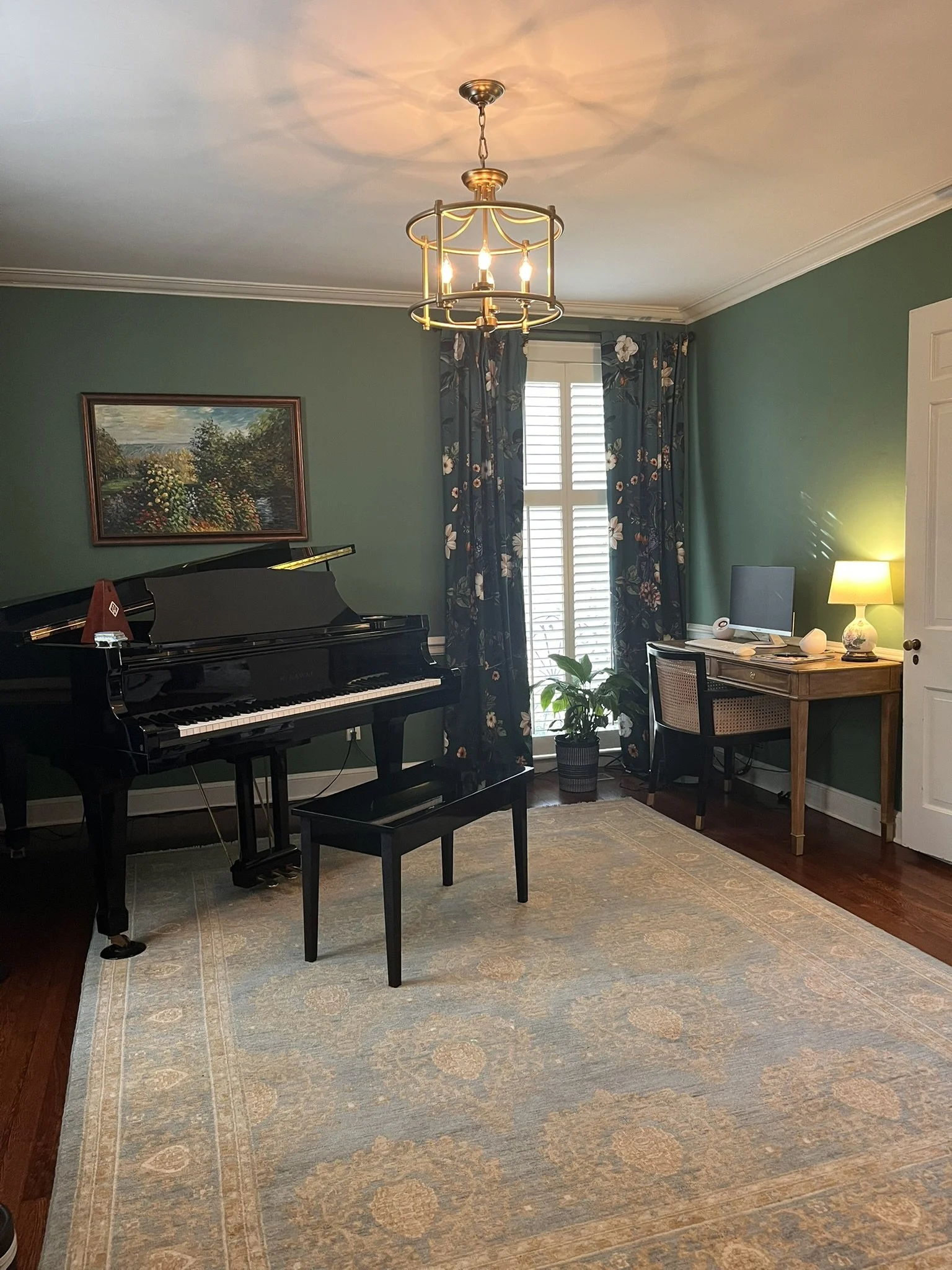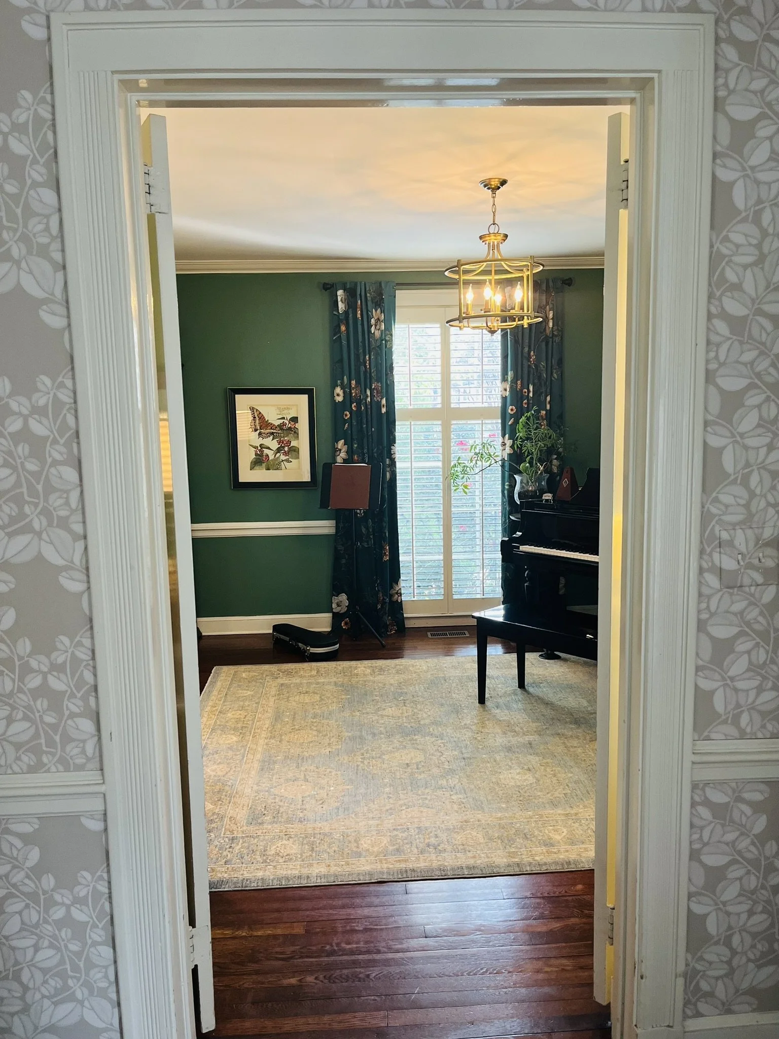 A few years later, my parents decided to downsize, and I had the chance to bring home their baby grand piano—a dream come true! I’ve always loved this piano, so I gave away my upright and then faced a new challenge: where to put it? Our formal living room didn’t have the space, so I had to rethink our layout. Since we rarely used the dining room (I didn’t have a formal dining table or host formal dinner parties), I decided to move our large table back to the room off the kitchen and transform this space into what we now call the music room/office.