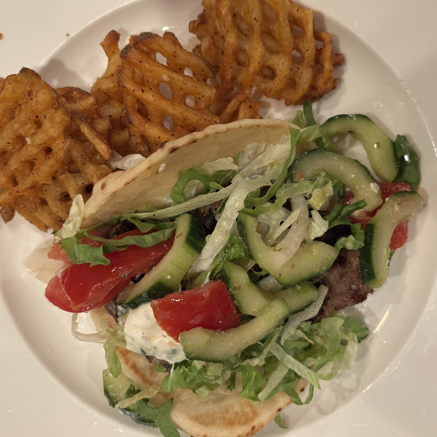 Assemble: Spread tzatziki on the naan, add your burger(s), top with lettuce and a scoop of the Greek salad.